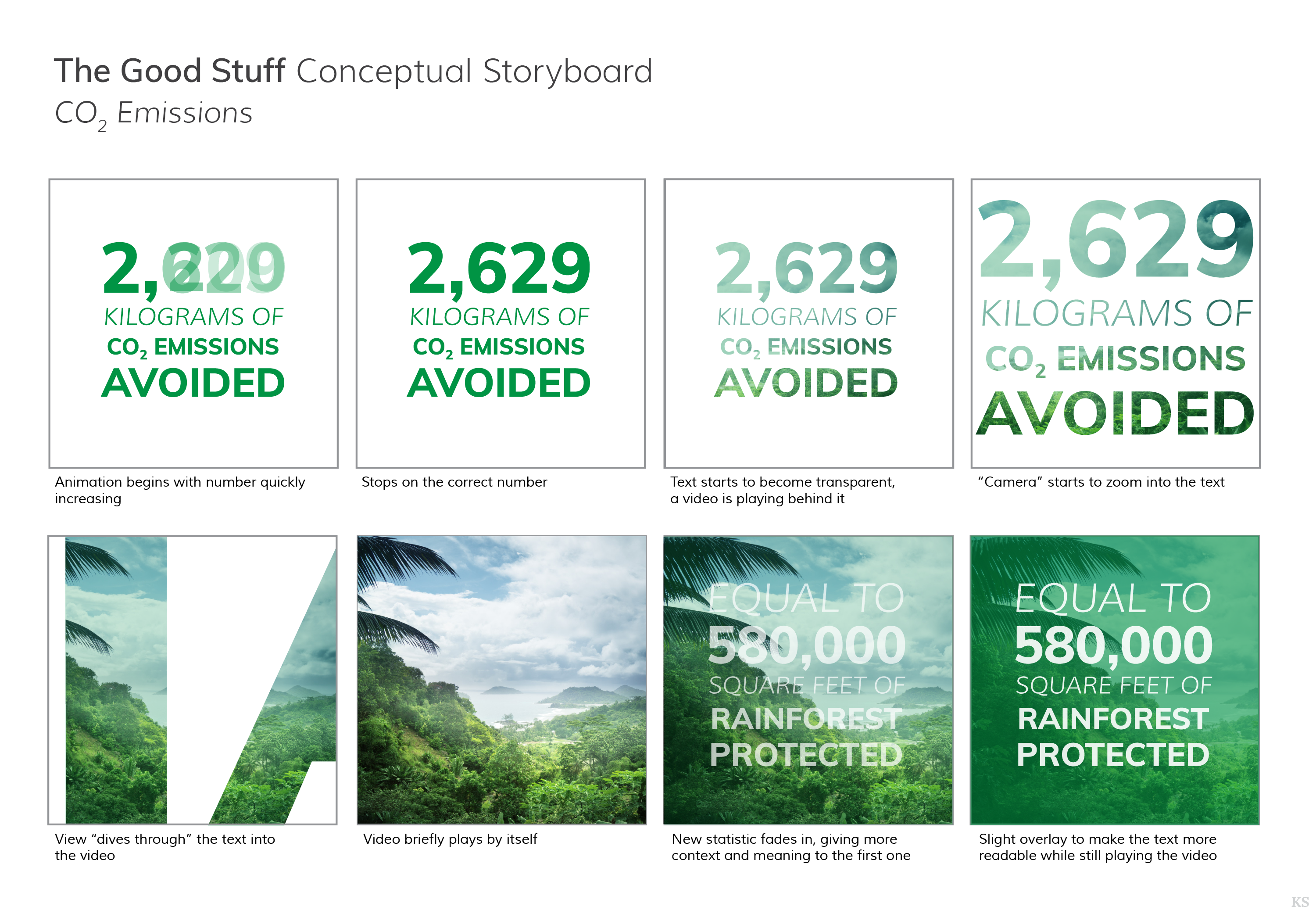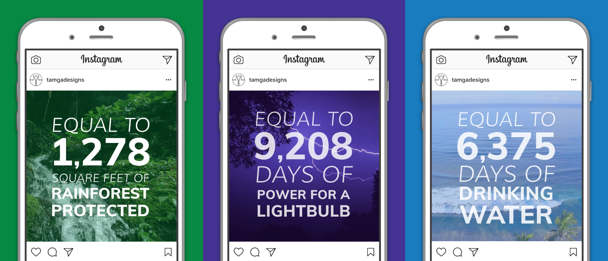 The first step was to brainstorm the most effective way to present the numbers. Technical units of measurement aren't very engaging to the average consumer, so it was important to contextualize the information. In collaboration with the research team, relevant metrics were found to emphasize TAMGA's real life impact. Talking in terms of rainforests, drinking water, and electricity makes the numbers much more accessible to TAMGA's audience.
