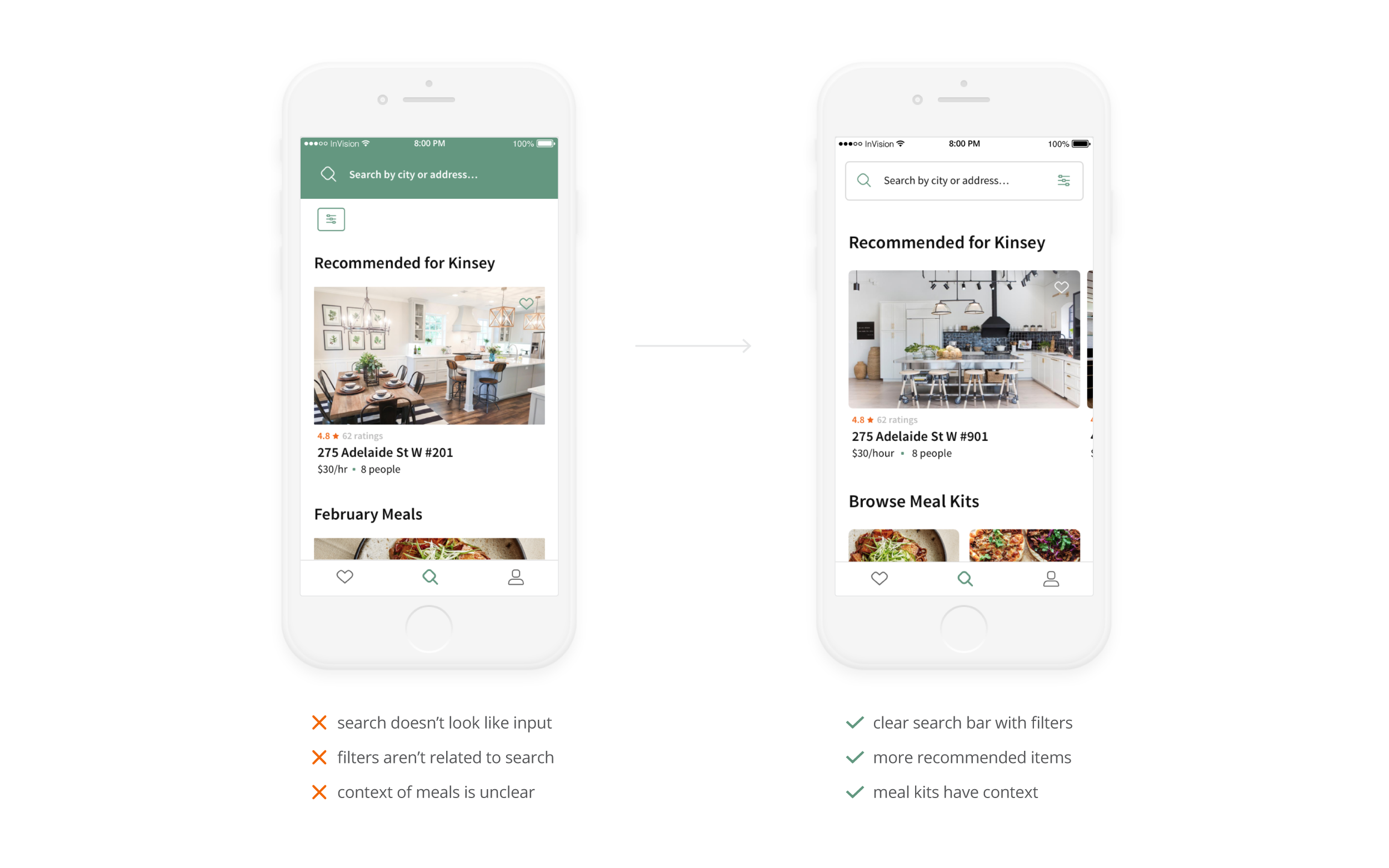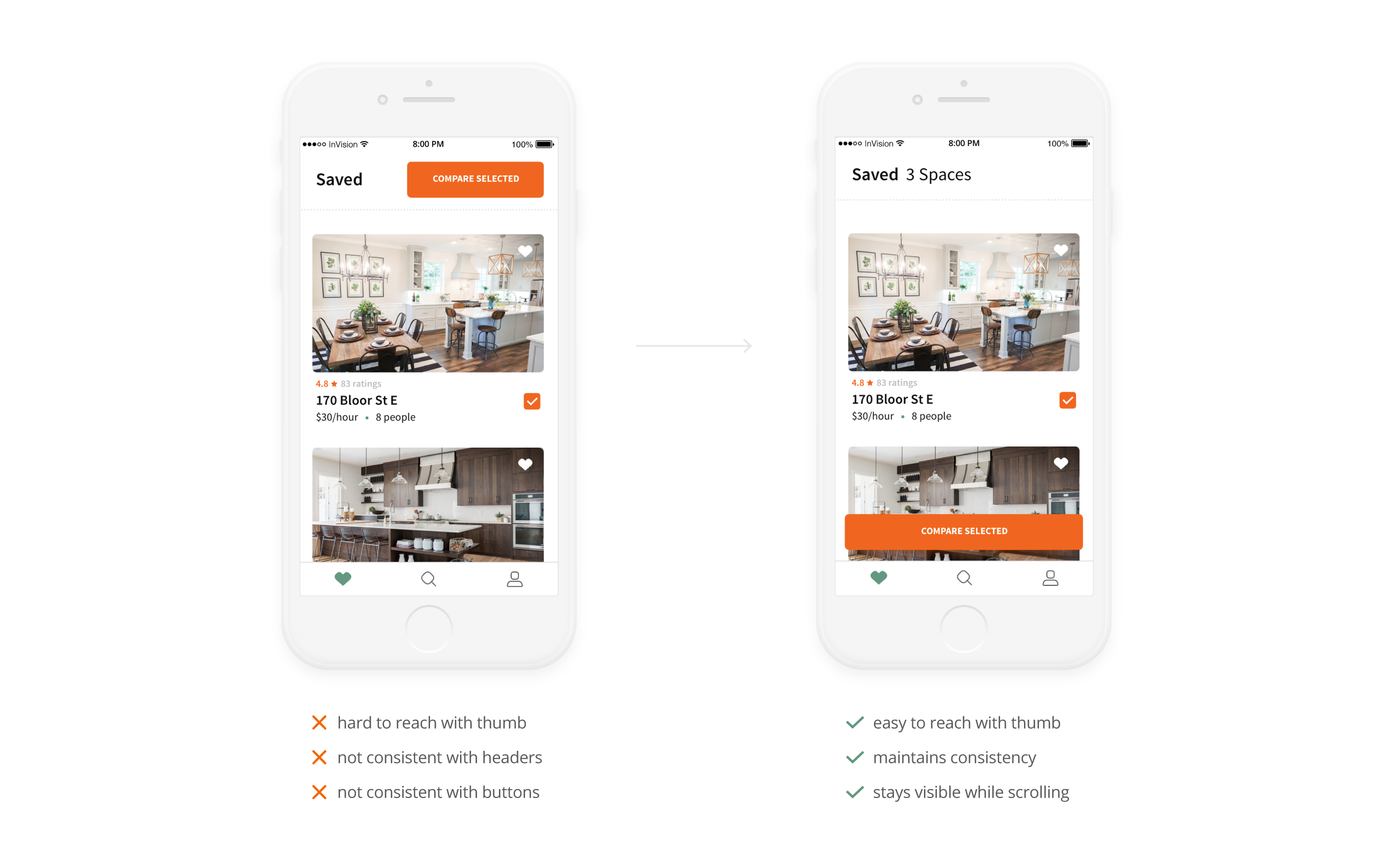 Feedback from user testing informed design changes like improved button placement, clearer UI elements, and more concise copy. For example, on the Saved screen, the Compare Selected button was inconsistent, hard to reach, and not always visible. All of these issues were resolved by moving it to the bottom of the screen and making it sticky.