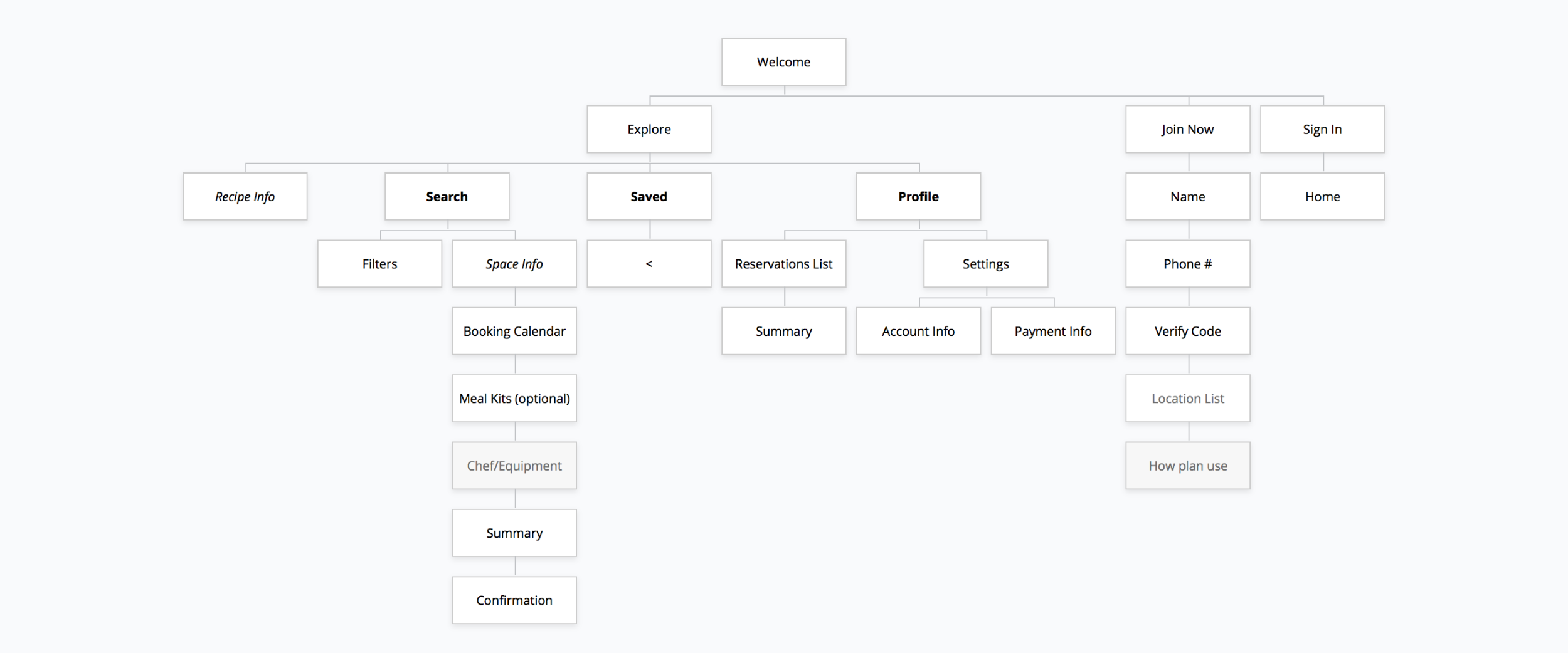 The information architecture mapped the flow of the app. The wireframes planned the scale and placement of UI elements before considering the visuals. The goal was to create an intuitive, logical sequence of events. New features were added based on necessity, like the Comparison tool (comparing the details of two space on one page) and the Gallery screen (viewing all photos of a space on one grid).