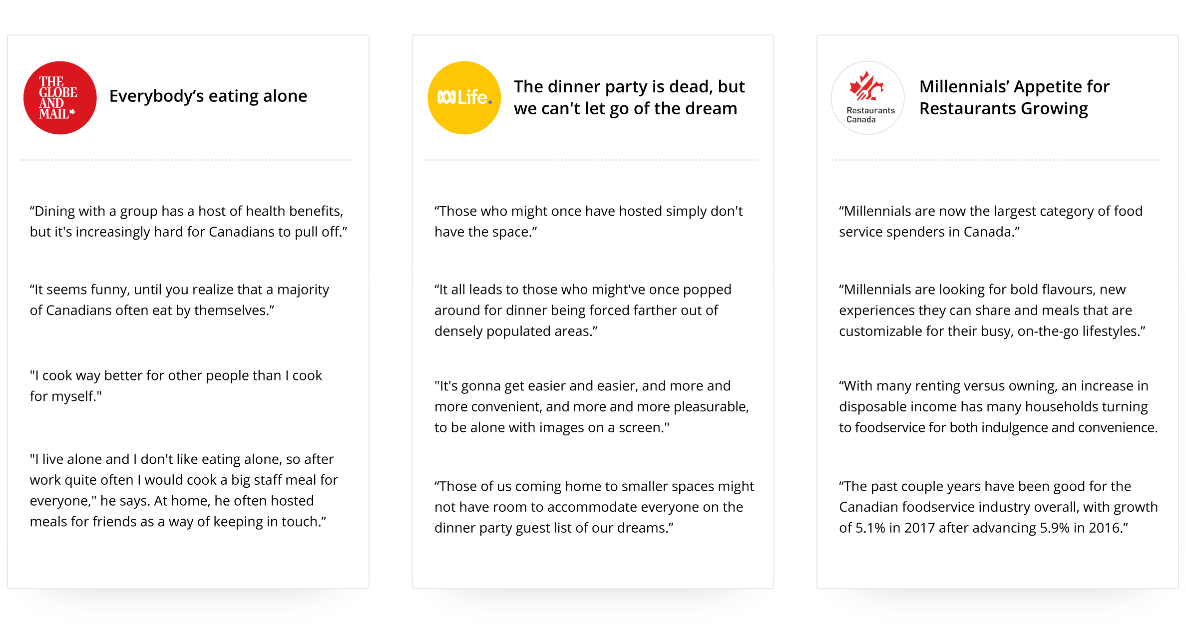 As cities grow, living spaces shrink. Young adults want to host and cook for their friends, but apartments rarely have the space. Kitchens are tiny and lack equipment, while dining areas are often defined by a single table or couch. Other deterrents include cleaning up before and after, washing dishes, and planning a meal. Yet, “with many renting versus owning, an increase in disposable income” means that city-dwellers have a large budget for food and entertainment.