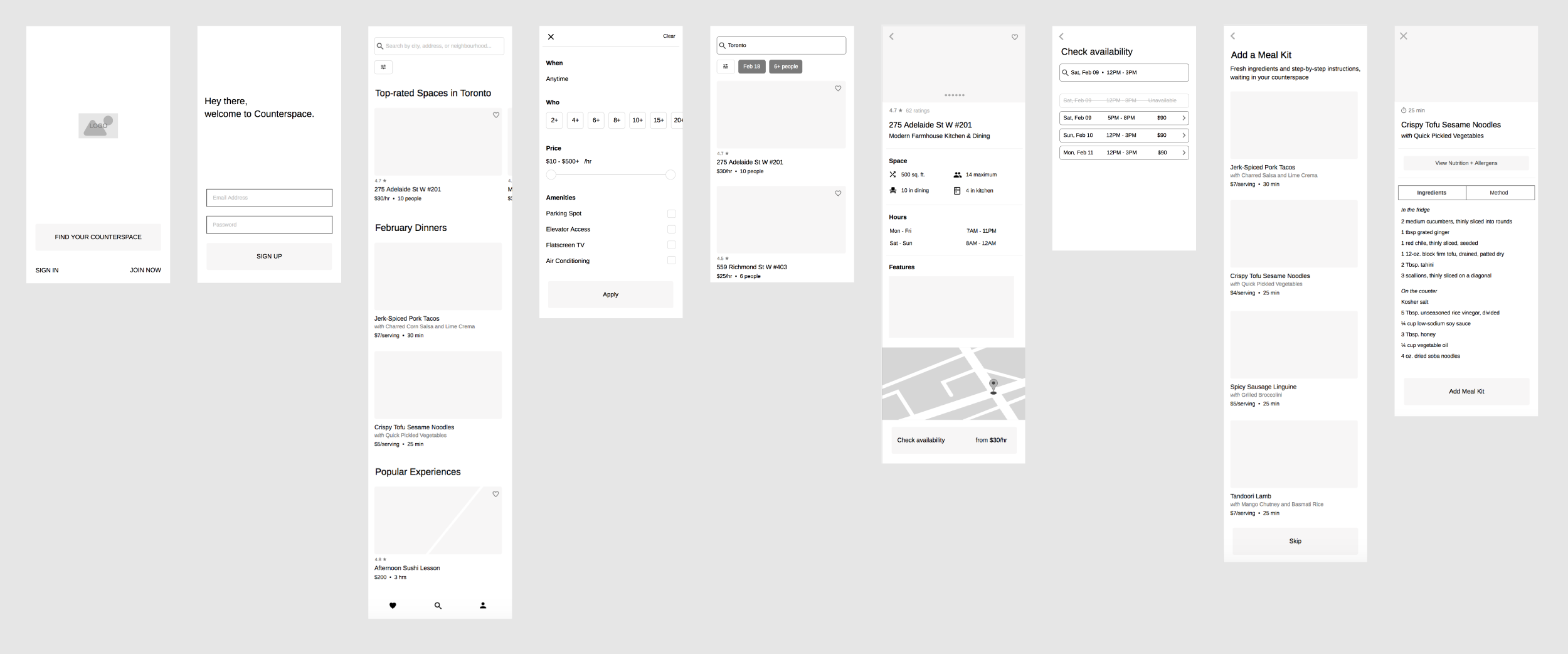 Common frustrations included a lack of space, time, and resources, while common desires were to eat, cook, and experiment in the kitchen. The demographic is young, adventurous, and tech-savvy. Secondary uses for Counterspace: start-up test kitchen; venue for events, team-building activities, or cooking lessons.